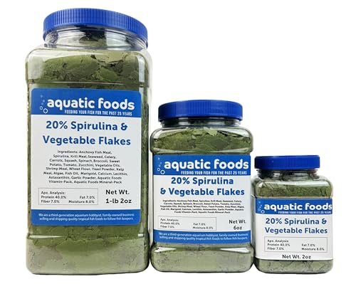 Aquatic Foods Inc. Premium Spirulina & Vegetable Flakes with 20% spirulina are excellent for African cichlids. They provide essential nutrients and enhance coloration. These flakes support a balanced diet, promoting health and vibrant colors, ideal for cichlid species and other tropical fish.