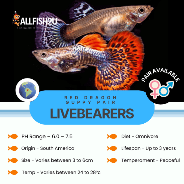 Red Dragon Guppies show clear signs when ready to breed. Males become more colorful and active. Females’ bellies look rounder as they carry eggs.